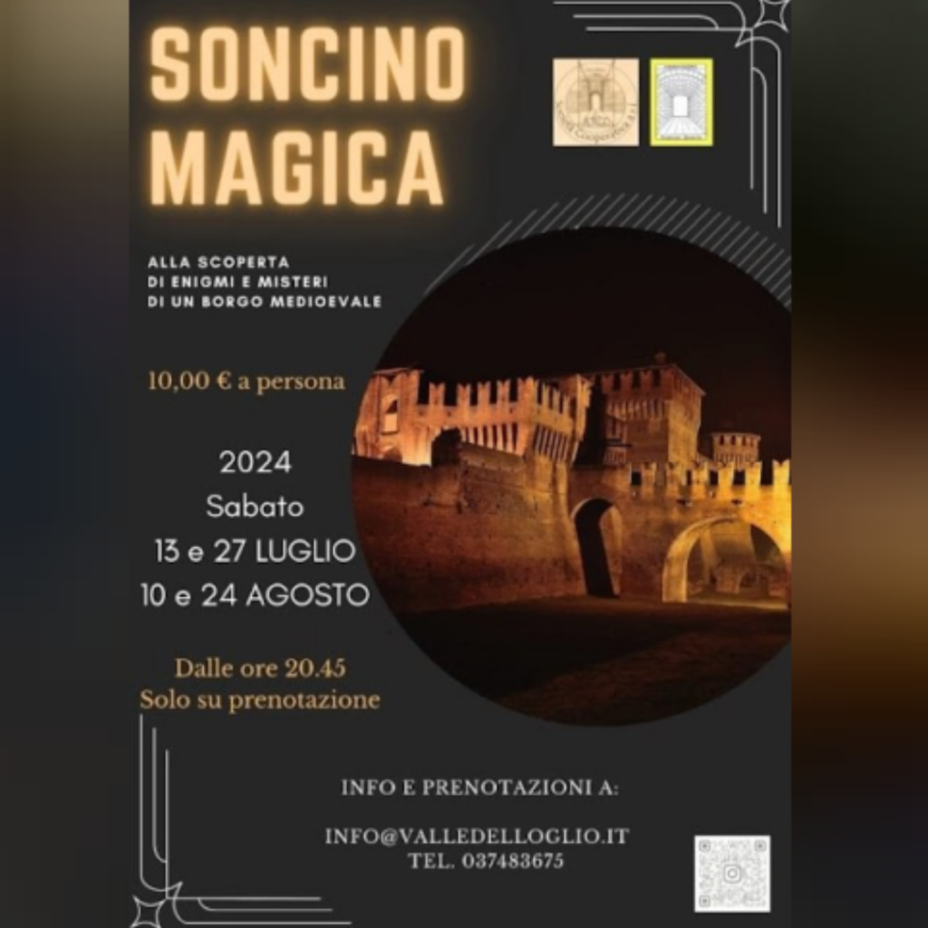 Sabato 24 agosto alle ore 20,45, visita guidata serale al borgo medievale di Soncino attraverso un percorso dall’atmosfera incantata per scoprire luoghi magici e i segni di un passato ricco di segreti irrisolti.