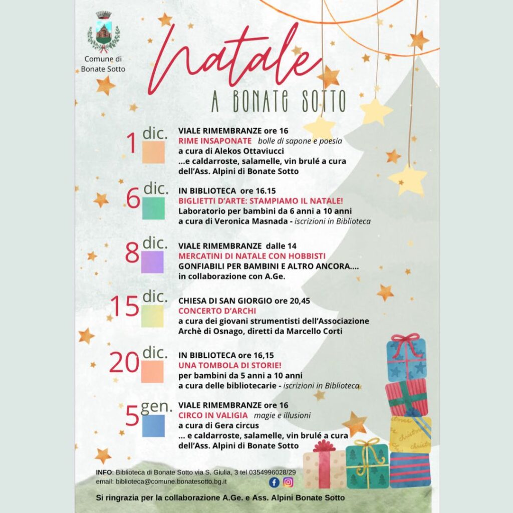Il 1° dicembre alle 16:0 lasciati incantare da “Rime Insaponate”: uno spettacolo di poesia e bolle di sapone con Alekos Ottaviucci. Dopo, gusta caldarroste, salamelle e vin brulé con gli Alpini. Invece, l’8 dicembre, dalle 14:00, torna la magia dei Mercatini di Natale con hobbisti, gonfiabili e tante sorprese per i più piccoli.