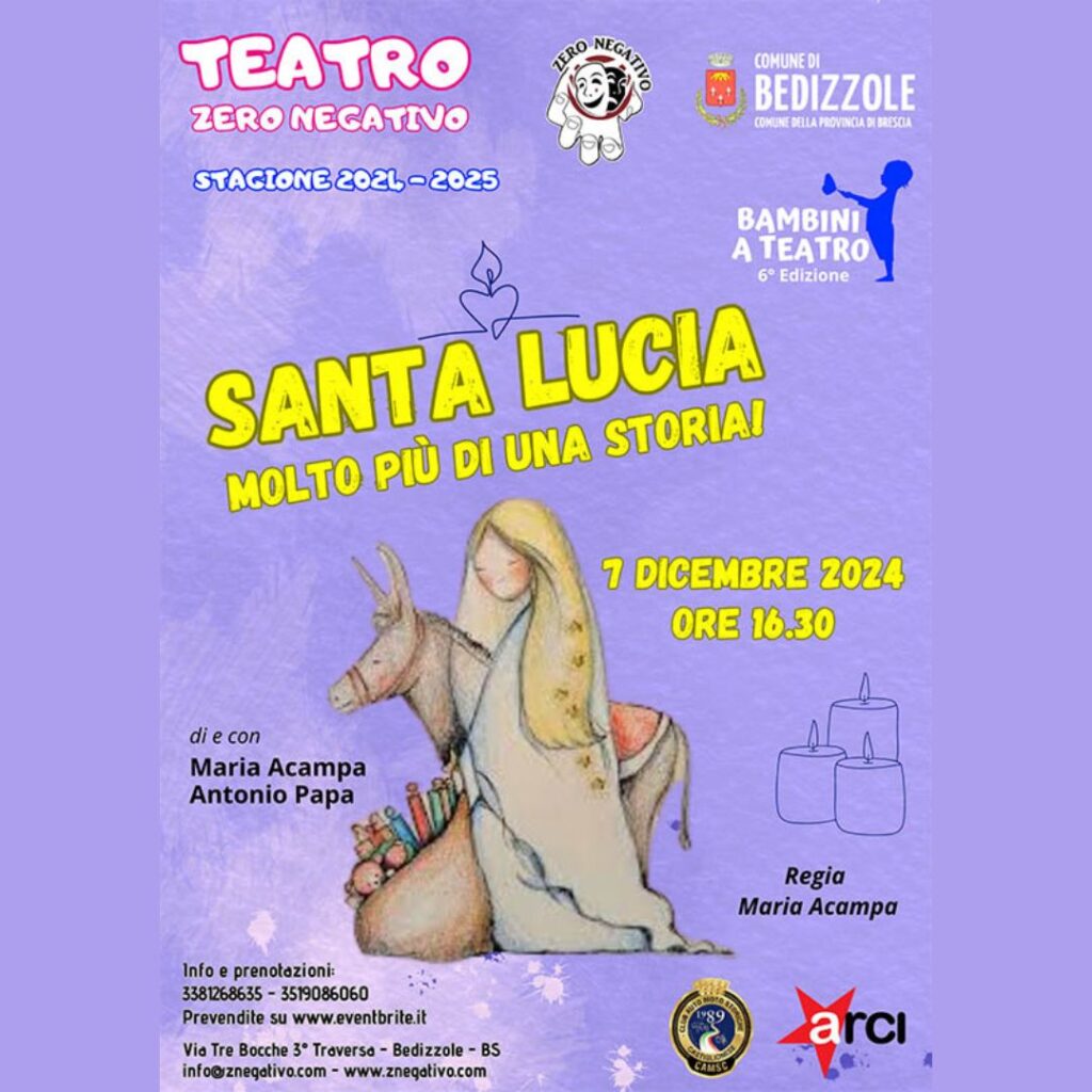 Il 7 dicembre alle 16:30, il Teatro Zero Negativo di Brescia presenta “SANTA LUCIA: molto più di una storia!“, uno spettacolo per bambini che esplora la tradizione di Santa Lucia attraverso racconti e attività interattive. Un’occasione per avvicinare i più piccoli alle tradizioni locali in modo divertente e coinvolgente.