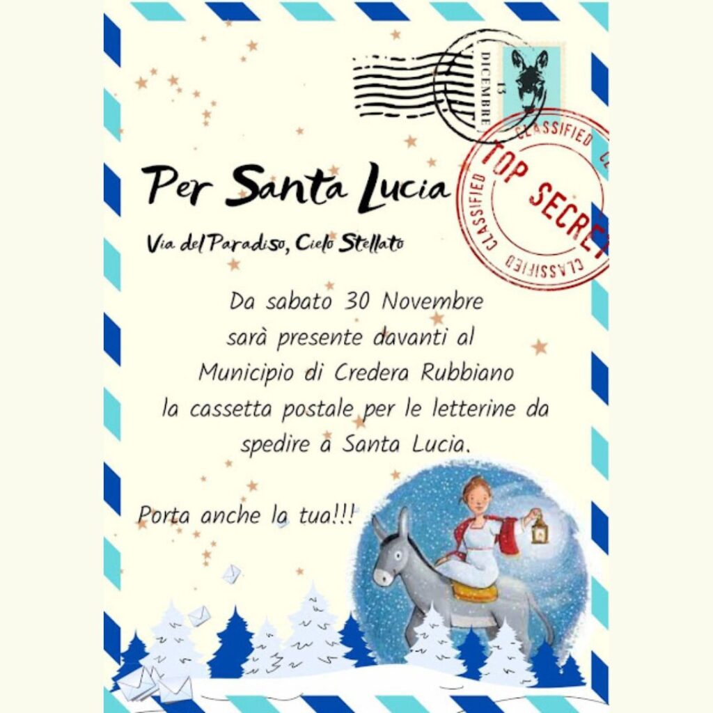 A partire da sabato 30 novembre, davanti al Municipio di Credera Rubbiano sarà presente la speciale cassetta postale per spedire le letterine a Santa Lucia!  Porta anche quella del tuo bambino o bambina e vivete la magia di questa tradizione natalizia!