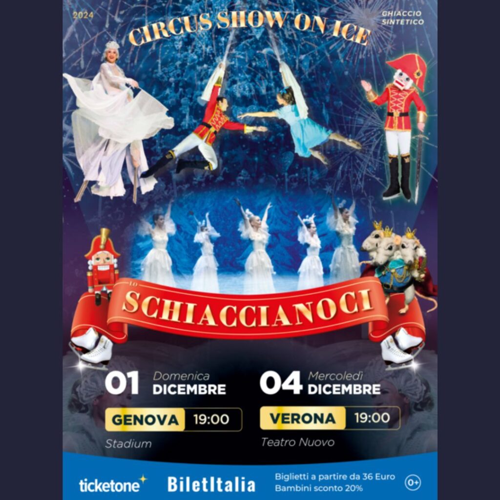 Un magico spettacolo di circo-sul-ghiaccio ispirato al classico di Tchaikovsky, con acrobati, pattinatori e scene incantevoli come il “Ballo dei Fiocchi di Neve” e il “Valzer dei Fiori”. Su ghiaccio sintetico ecologico, un evento emozionante per grandi e piccoli che unisce arte e sostenibilità!