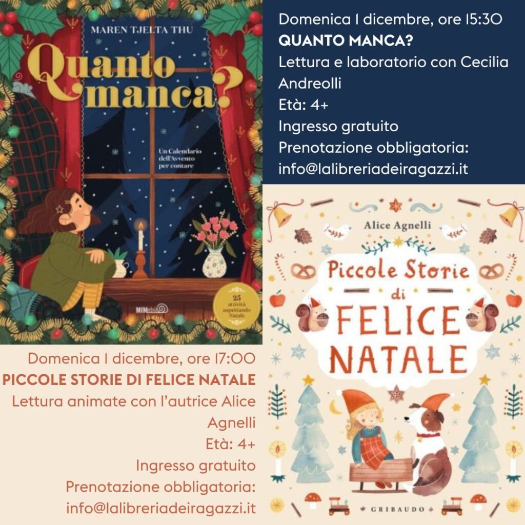Domenica 1 dicembre, la Libreria dei Ragazzi ti invita a due eventi natalizi! Alle 15:30, Cecilia Andreolli presenta Quanto manca? con una lettura e un laboratorio creativo. Alle 17:00, Alice Agnelli, autrice di Piccole Storie di Felice Natale, coinvolge i bambini con storie e ricette natalizie.