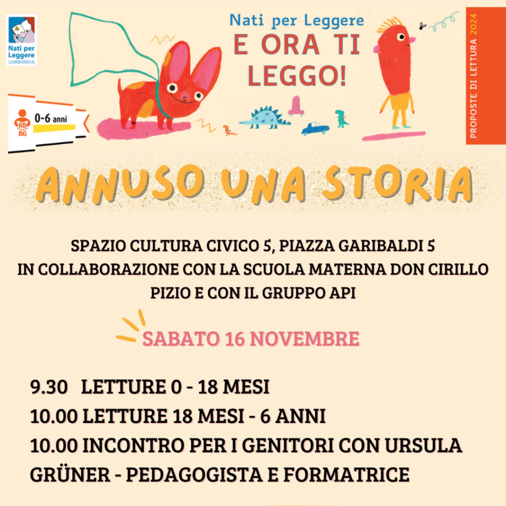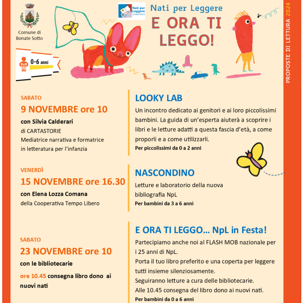 La Biblioteca di Bonate Sotto invita i più piccoli e le loro famiglie a “Nati per Leggere“, un momento speciale dedicato alla lettura per i bambini. Con racconti selezionati e letture animate, i più piccoli potranno scoprire il piacere dei libri in un ambiente accogliente e stimolante. Un’occasione per avvicinare i bambini al mondo della lettura, condividendo momenti di scoperta e fantasia insieme ai genitori.