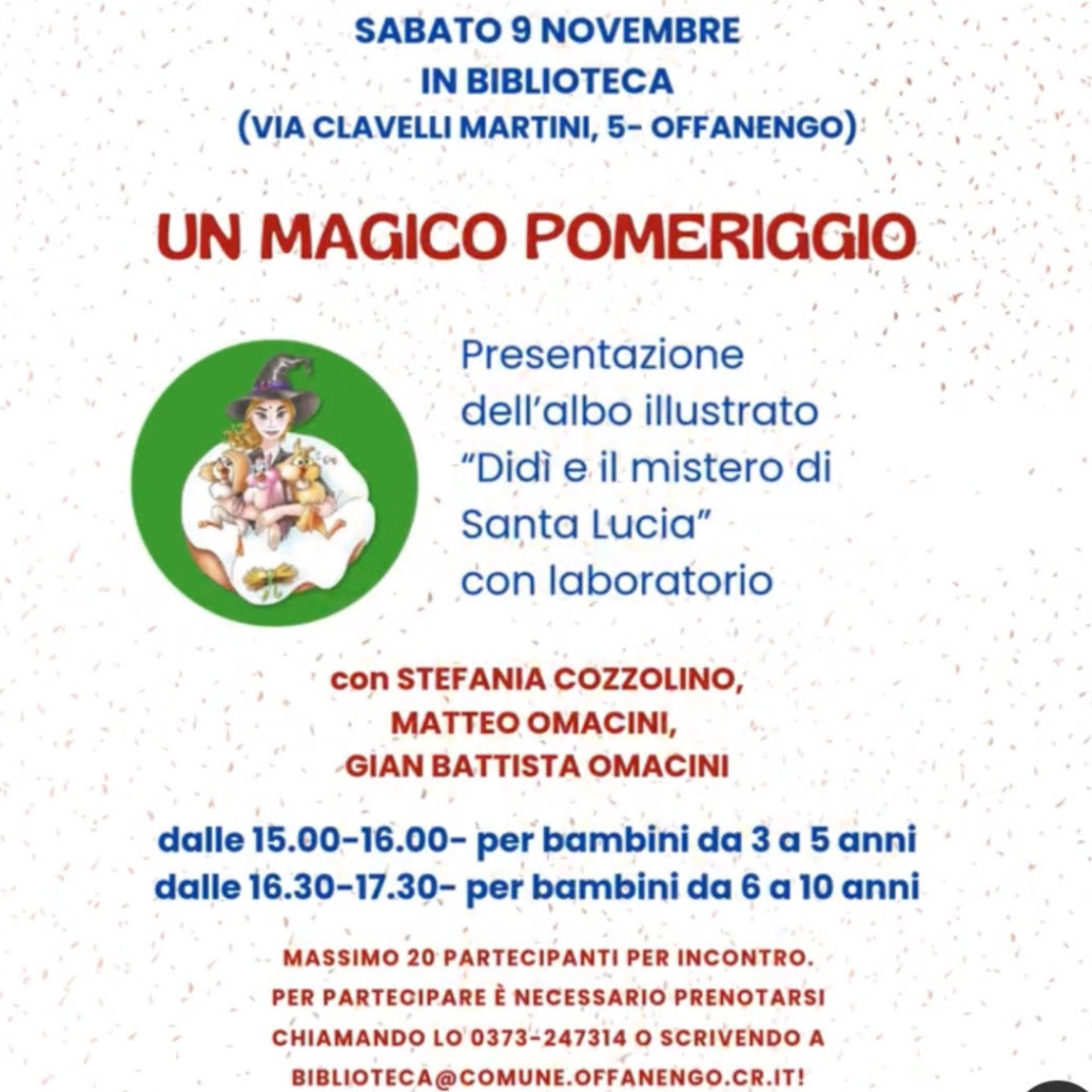 Sabato 9 novembre, la Biblioteca di Offanengo invita i più piccoli a “Un Magico Pomeriggio” con la presentazione dell’albo illustrato Didi e il mistero di Santa Lucia. Con letture animate e un laboratorio creativo, i bambini esploreranno una storia incantata insieme agli autori Stefania Cozzolino, Matteo e Gian Battista Omacini. Un’occasione speciale per vivere la magia della lettura e della creatività!