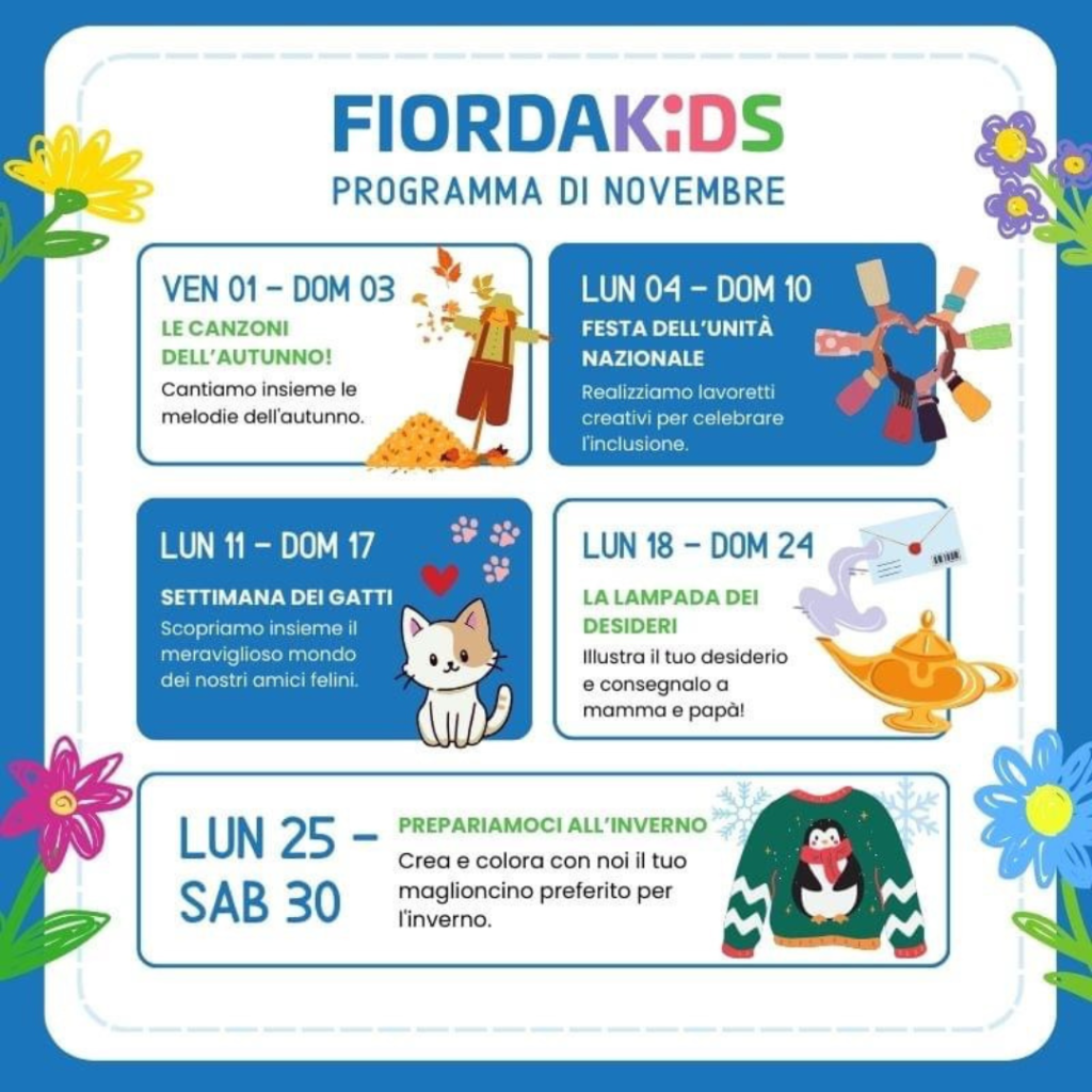 FiordaKids propone un novembre ricco di attività! Dai lavoretti per l’Unità Nazionale (4-10 nov) alla Settimana dei Gatti (11-17 nov), i bimbi esploreranno temi diversi. Laboratori creativi, giochi e attività interattive coinvolgeranno i più piccoli in un’esperienza educativa e divertente, celebrando valori di unità e solidarietà in modo giocoso e coinvolgente.