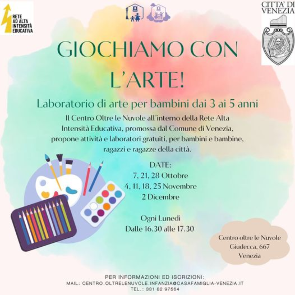 Il Centro oltre le Nuvole, con sede in Giudecca – Venezia all’interno della Rete Alta Intensità Educativa, promossa dal Comune di Venezia, propone attività e laboratori gratuiti, per bambini e bambine, ragazzi e ragazze della città.