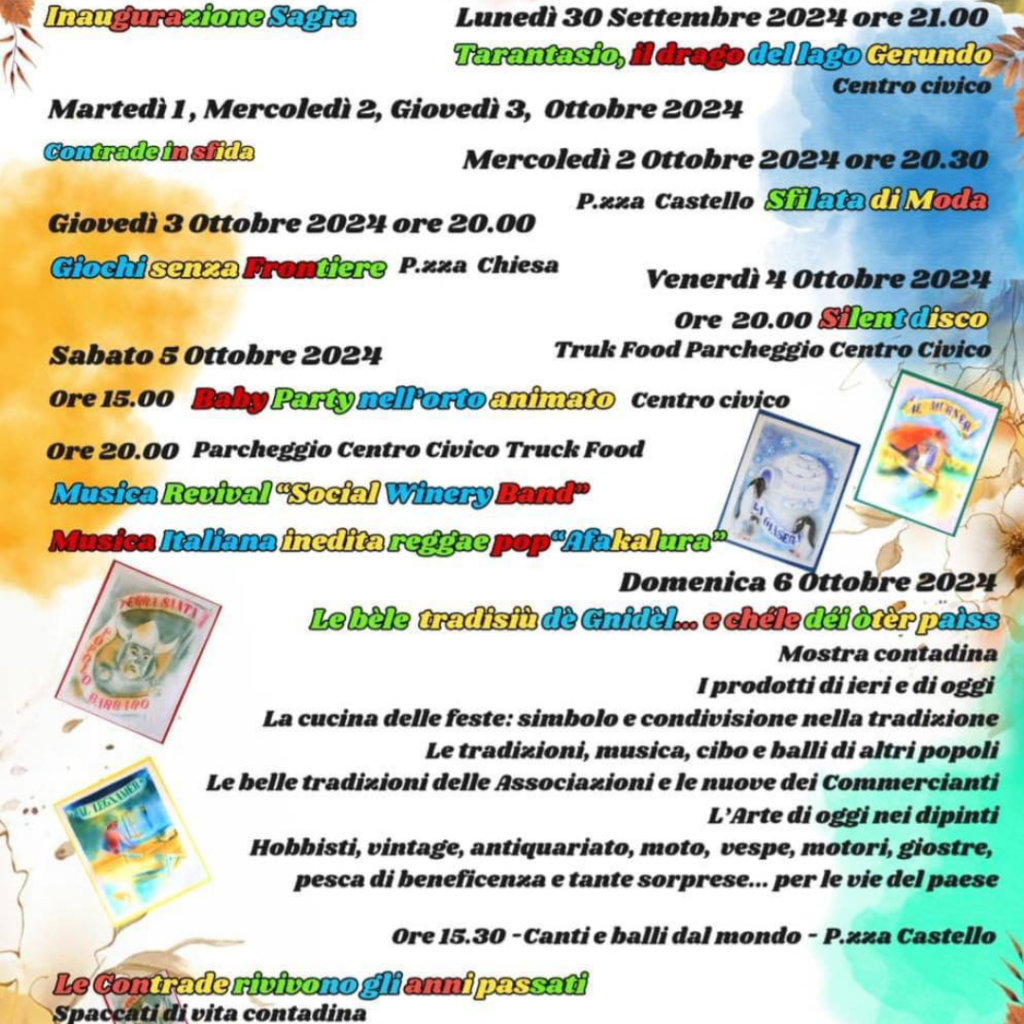 Torna la consueta sagra di Ottobre che quest’anno vedrà il paese coinvolto in otto giorni di festa. Dal 29 Settembre al 7 Ottobre musica, eventi culturali, sfilate e giochi si susseguiranno per dar vita ad una sagra senza precedenti, in cui le contrade saranno nuovamente le principali protagoniste.